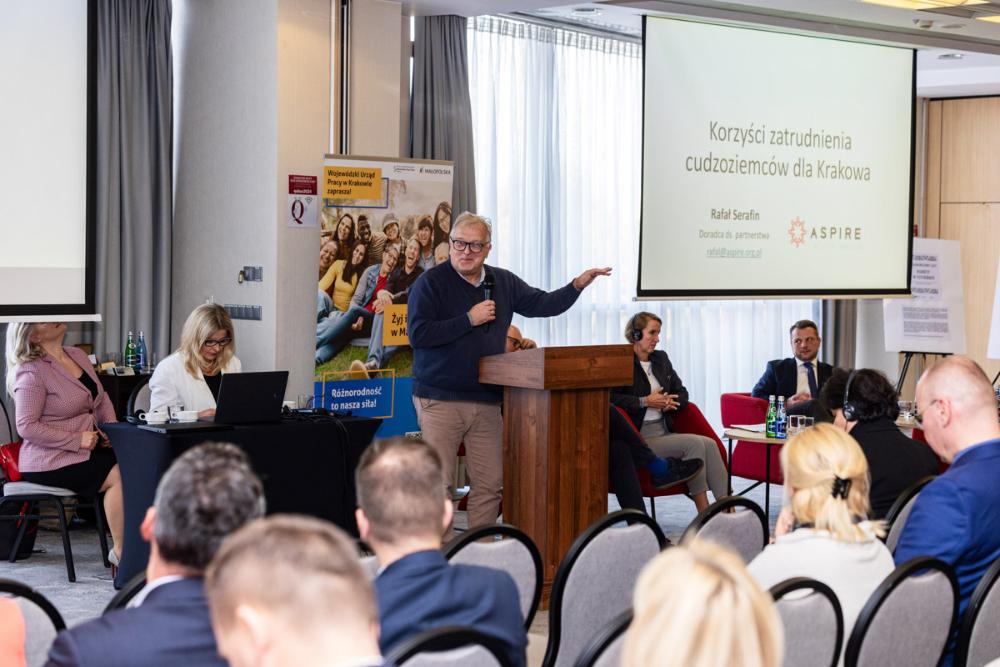 Konferencja skupiła się również wokół roli, jaką migranci, którzy mają praw do pracy w Polsce odgrywają na rynku pracy, w sytuacji malejącej w naszym kraju liczby osób w wieku produkcyjnym i coraz większego deficytu pracowników, o czym mówili ekspert ZUS – Adrian Kilichowski i Adam Biernat z Wojewódzkiego Urzędu Pracy w Krakowie.